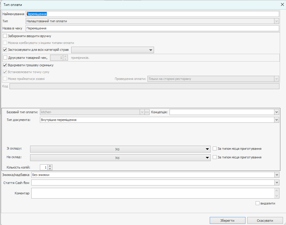 Для Налаштованого типу оплати необхідно встановити базовий тип оплати. У поточній версії системи в якості базового типу оплати можна використовувати будь-який тип оплати, за винятком власного типу оплати з типом оплати «Без доходу» або типом оплати «Готівка», наприклад.