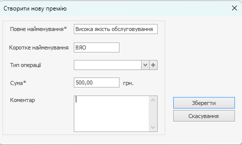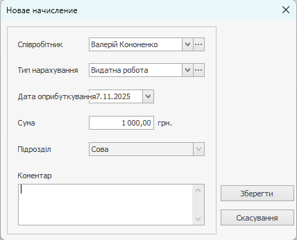 При необхідності в полі Коментар введіть додаткову інформацію про нарахування і натисніть кнопку Зберегти.