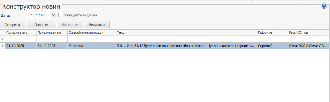 Такі повідомлення формуються в розділі Адміністрування → Конструктор новин. Для доступу до розділу необхідне право B_EA Робота з конструктором новин.