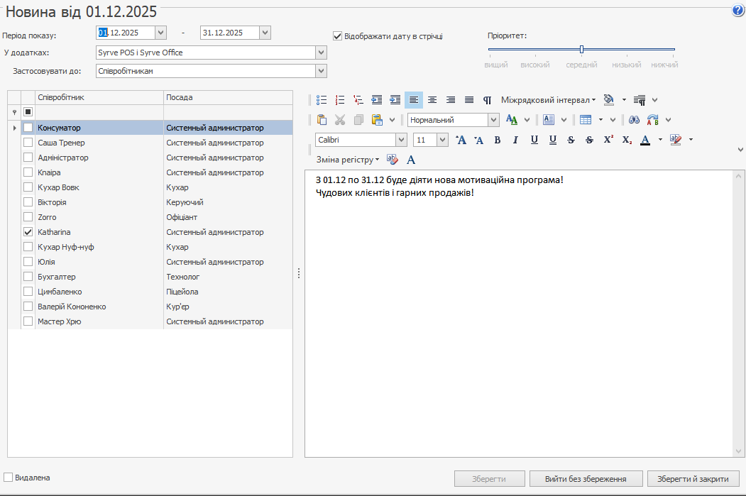 Вкажіть, в який період і для яких торгових підприємств має відображатися повідомлення. В яких додатках: Syrve POS, Syrve Office або Syrve POS і Syrve Office. Для кого призначено, окремим співробітникам або посадам. У конструкторі є основні засоби для форматування тексту.