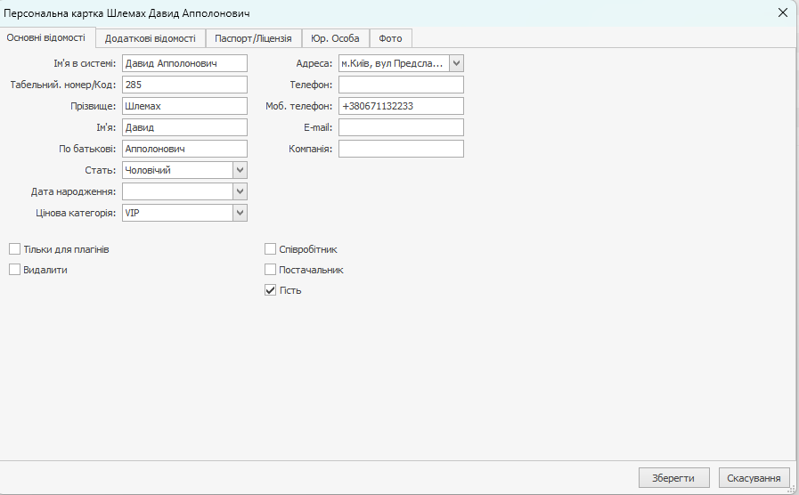 - При необхідності в полях Прізвище, Ім'я, По батькові, Стать, Адреса, Телефон і Моб. Телефон, Компанія, E-mail введіть додаткову інформацію про вашого гостя. Код гостя заповнюється автоматично. Ви можете змінити це значення, при цьому воно повинно бути унікальним в системі.