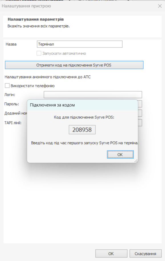 Syrve POS.Запам'ятайте цей код, він знадобиться для підключення Syrve POS до сервера.