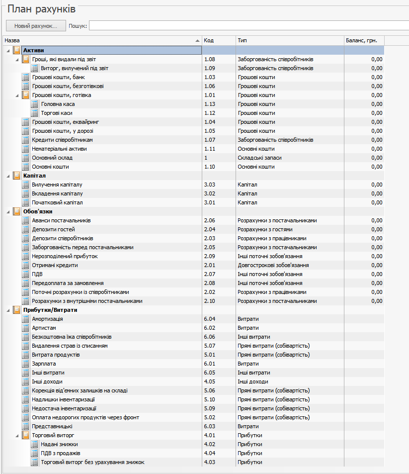 План рахунків викликається за допомогою пункту меню Фінанси → План рахунків.