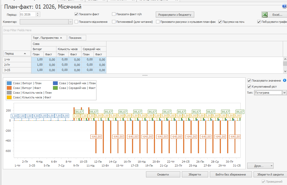 Заплановані показники можна порівняти з фактичними за поточний період або за минулий, а також проаналізувати відхилення від плану. Для цього встановіть галочки Показати факт, Показати факт п/п і Показати відхилення.