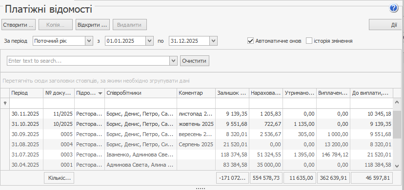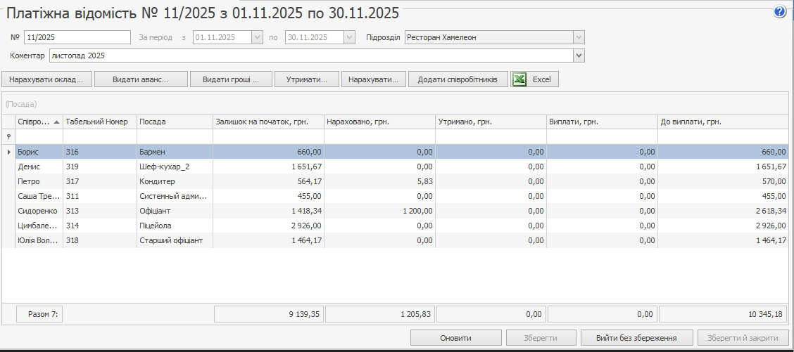 - Зареєструйте всі необхідні виплати та утримання по співробітниках.