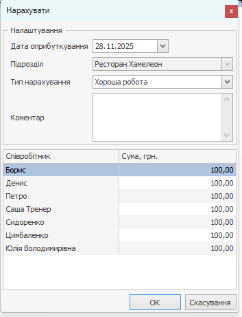 ◌ Виберіть одного або декількох співробітників за допомогою клавіш Ctrl або Shift. - Натисніть кнопку Нарахувати... або Утримати... У вікні, що відкрилося: