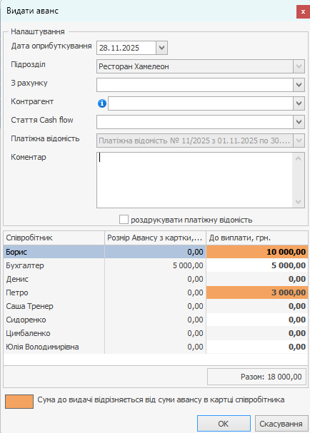 a. Для кожного співробітника вказана сума авансу з поля Аванс на вкладці Оплата його картки. Ви можете виплатити й іншу суму, наприклад, при частковій виплаті авансу. Такі значення виділяються кольором. Якщо введено нульове значення, то проводка не реєструється.