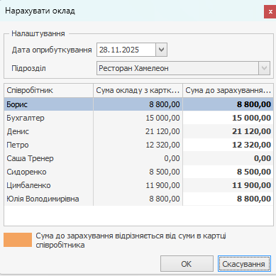 - Натисніть кнопку Нарахувати оклад. У вікні, що відкрилося: