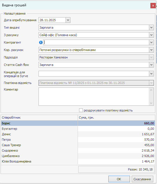 d. Введіть додаткову інформацію про операцію в полі Коментар. Вона буде відображатися в проводці по нарахуванню грошових коштів. - Натисніть кнопку ОК. Якщо ви помилилися при відборі співробітників, натисніть кнопку Скасувати і сформуйте список заново.