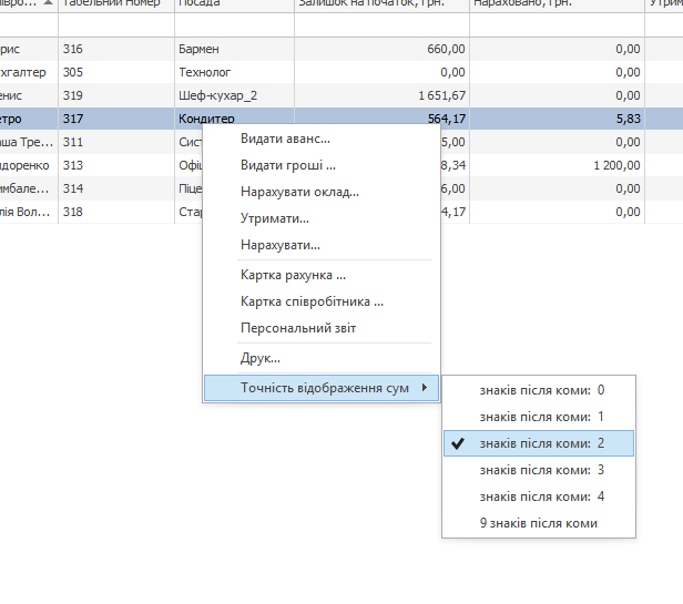 Наприклад, залишок 0,003456789 гривень можна побачити в Платіжній відомості тільки при точності 9 знаків після коми. Для цього призначено налаштування Точність відображення сум, що дозволяє вибрати точність 2, 4 або 9 знаків. Точність може бути встановлена в Платіжній відомості, Зведеному звіті по зарплаті, а також Персональному звіті вибором відповідного пункту контекстного меню. За замовчуванням суми показуються з точністю 2 знаки після коми.
