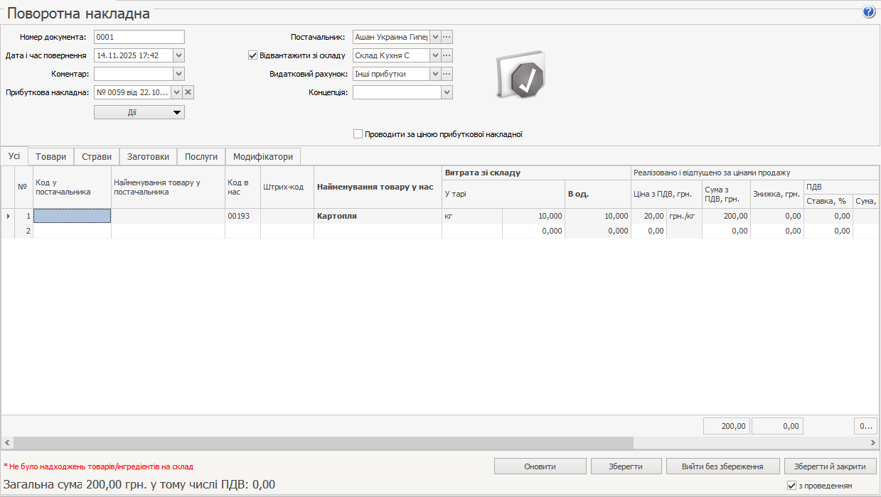 ● Для списання товарів за тією ціною, за якою вони були придбані, встановіть галочку Проводити за ціною прибуткової накладної. При цьому після проведення зворотної накладної система виконає перерахунок собівартості товарів на складі.