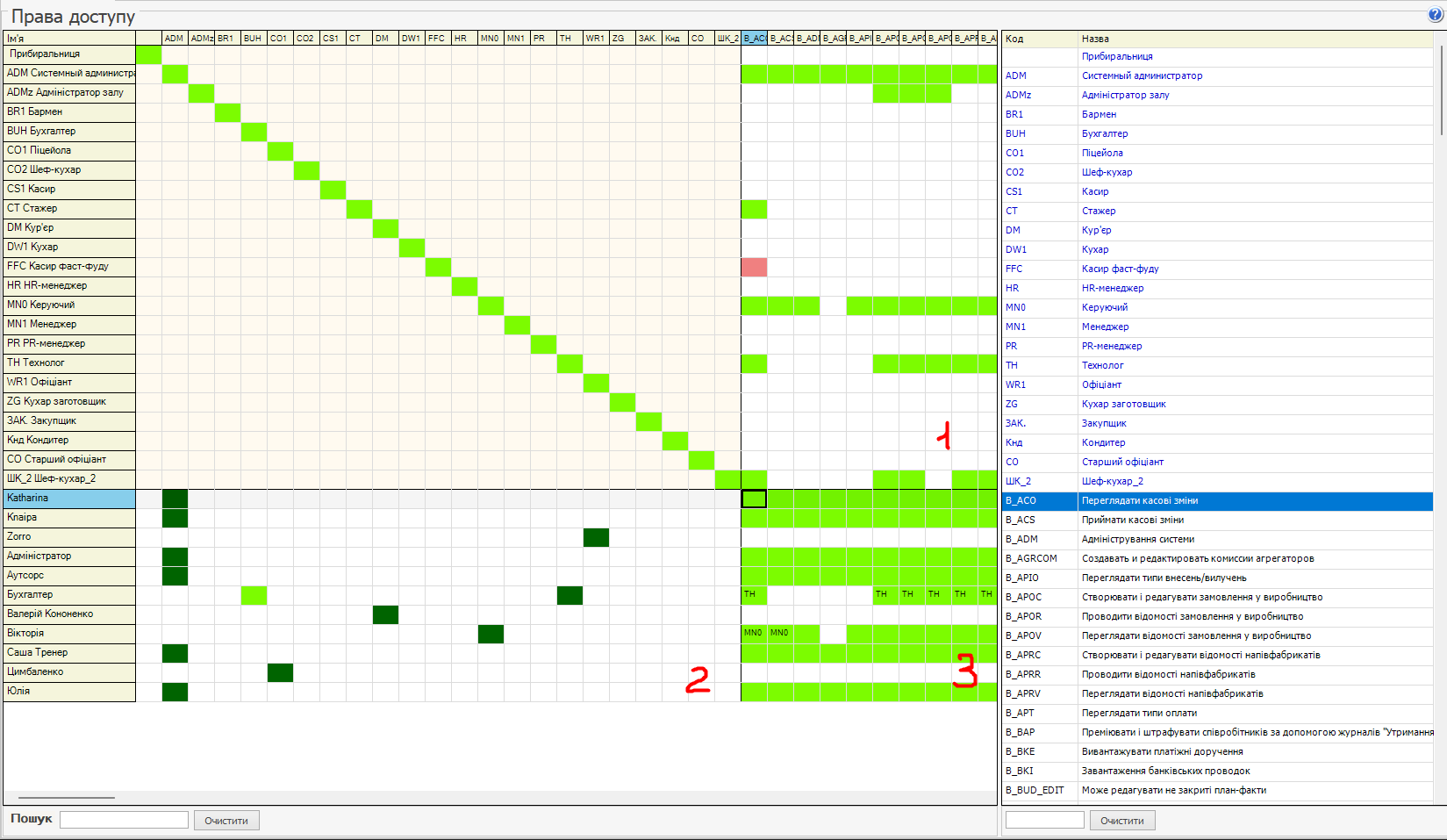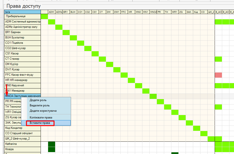 Коли співробітнику потрібно присвоїти набір прав посади, то це зручно зробити, двічі клацнувши мишкою по комірці, що знаходиться на перетині співробітник — посада.
