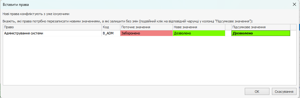 При перенесенні набору прав можуть виникати ситуації, коли поточне значення комірки відрізняється від нового. Наприклад, поточне значення — «Заборонено»