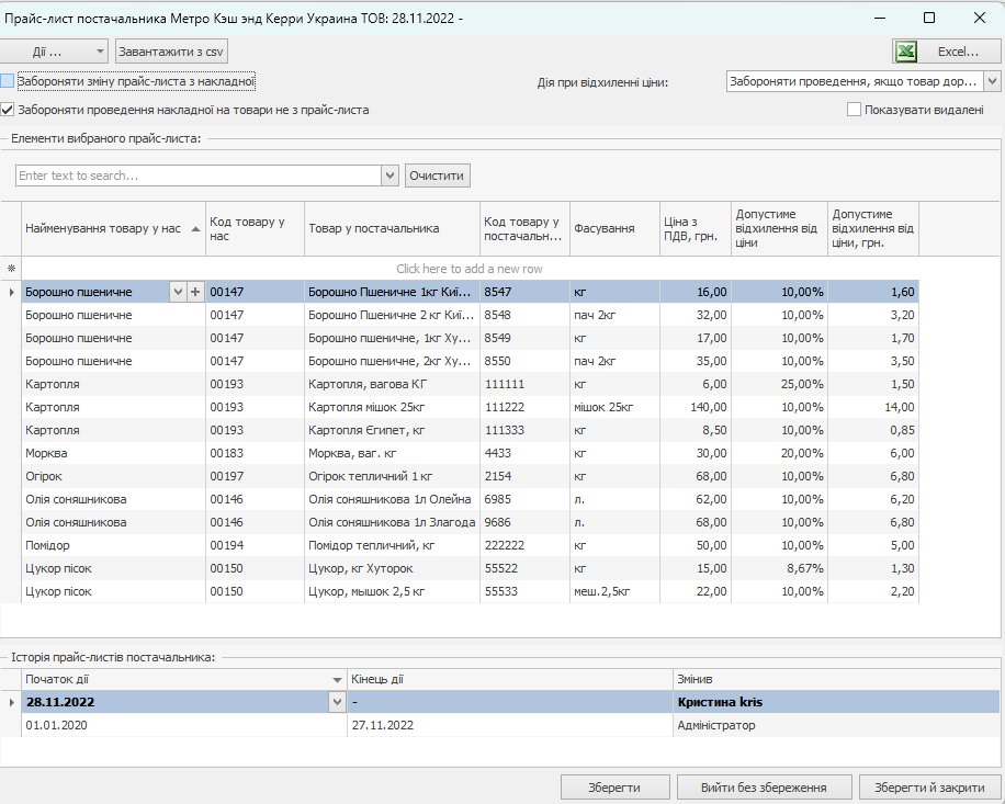 Інформація про новий прайс-лист автоматично записується в таблицю Історія прайс-листів постачальника: дата початку та закінчення дії і хто створив.
