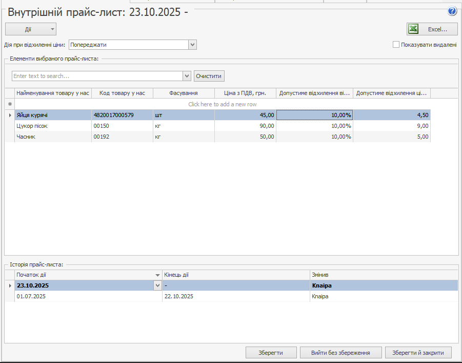 Щоб переглянути або змінити одну з попередніх версій прайс-листа, натисніть на відповідний рядок в історії. Його товари відображаться в таблиці Елементи обраного прайс-листа.