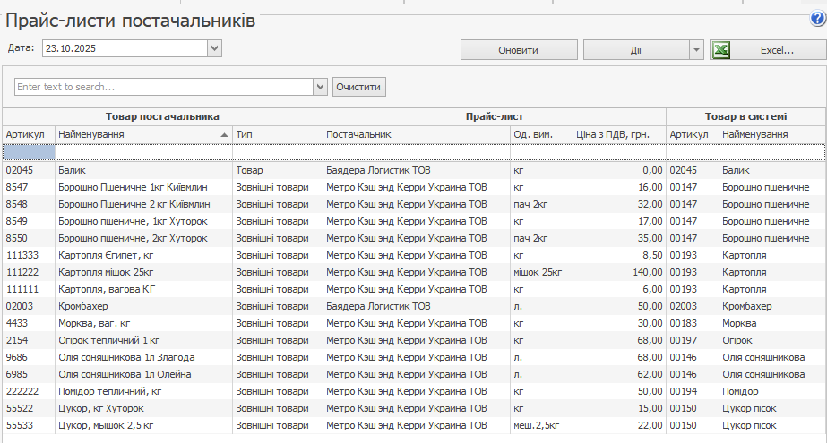 Для управління записами прайс-листів та товарами постачальників використовуйте спеціальний звіт Прайс-листи постачальників.