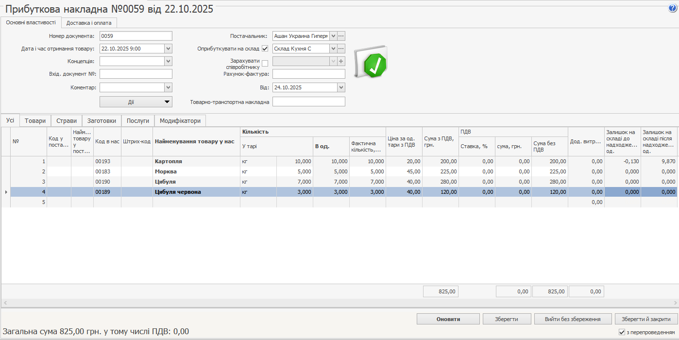 Оформлення прибуткової накладної