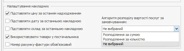 Щоб кожного разу при створенні накладної не вибирати алгоритм розподілу, налаштуйте його за замовчуванням на вкладці Налаштування обліку в налаштуваннях торгового підприємства. Додаткові витрати автоматично будуть розраховуватися за цим алгоритмом, а в меню Дії навпроти нього буде встановлено галочку.