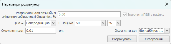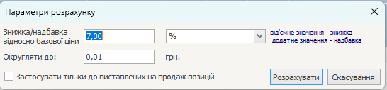- У вікні Параметри розрахунку задайте величину знижки або надбавки щодо базової ціни. Знижку вкажіть у вигляді від'ємного значення, наприклад -5.