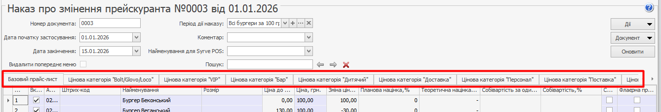 Кожна цінова категорія має в наказі свою закладку. За замовчуванням відкрита закладка з базовими цінами.