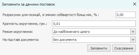 Процент изменения рассчитывается следующим образом. Вычисляется ССН на даты последней поставки (ССНп) и последнего приказа об изменении цены (ССНм). Определяется % изменения себестоимости: (abs (ССНм – ССНп)/ССНм) × 100%. Далее рассчитанный % изменения сравнивается с заданным. - Встановіть Кратність округлення розрахункового значення ціни та Режим округлення.
