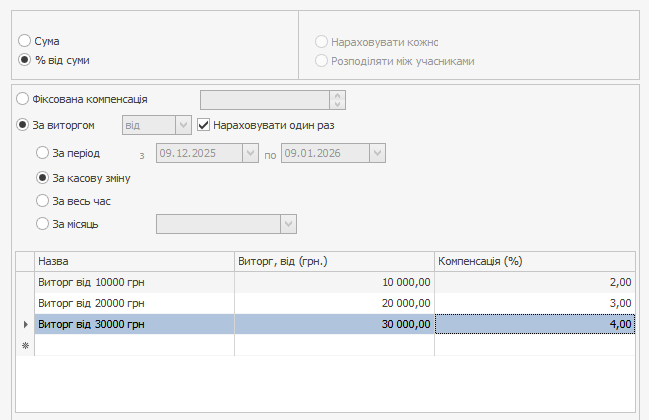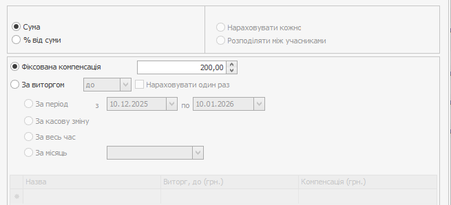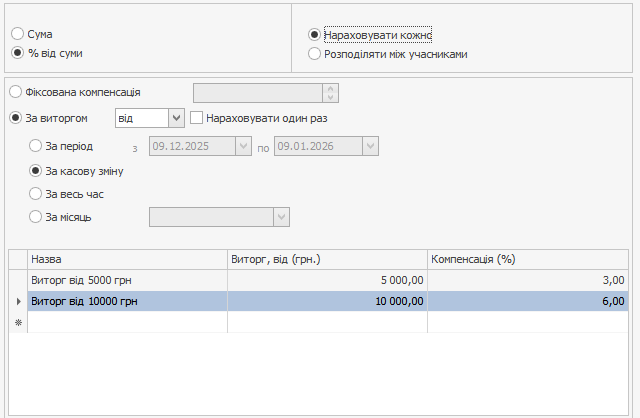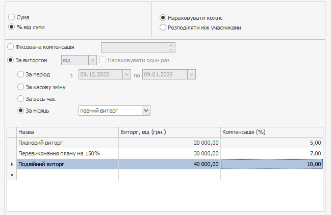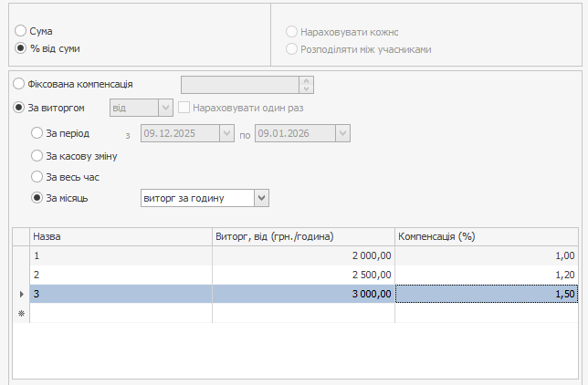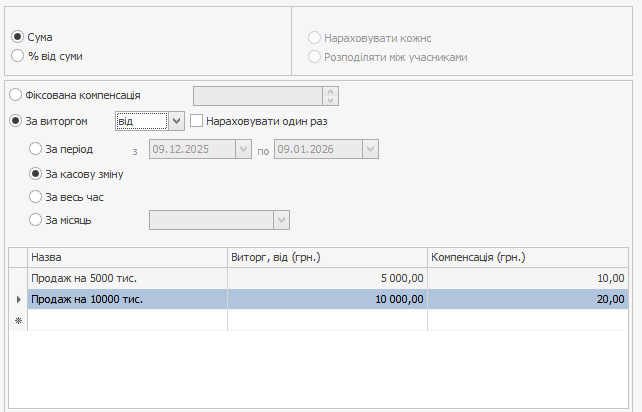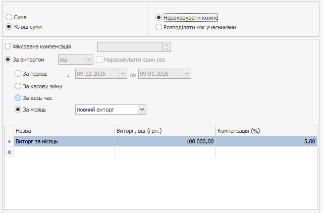 На вкладці Компенсація встановіть режим За виручкою → За місяць і задайте порогові значення за виручкою та розмір компенсації за їх досягнення.