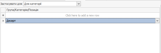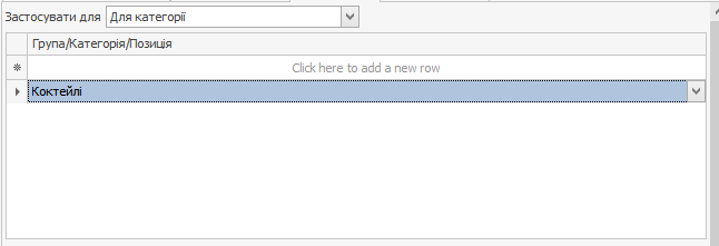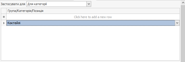 На вкладці Обмеження в полі Застосувати для виберіть пункт Для категорії та виберіть категорію Коктейлі.