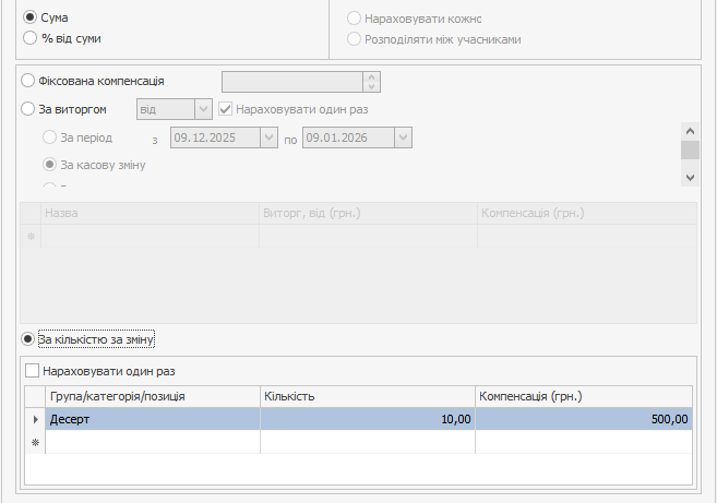 На вкладці Компенсація виберіть пункт Сума і встановіть режим Фіксована компенсація . Вкажіть розмір премії, яку отримає співробітник за продаж страв.
