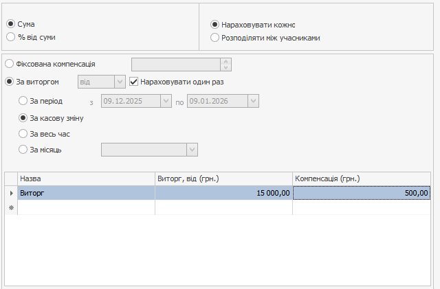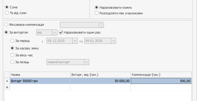 На вкладці Компенсація встановіть режим За виручкою → За касову зміну і задайте порогове значення виручки, при досягненні якого співробітники отримають премію.