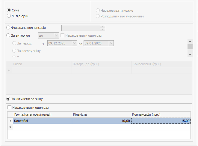 На вкладці Компенсація встановіть режим За виручкою → За кількістю за зміну і задайте порогове значення виручки, при досягненні якого співробітники отримають премію.