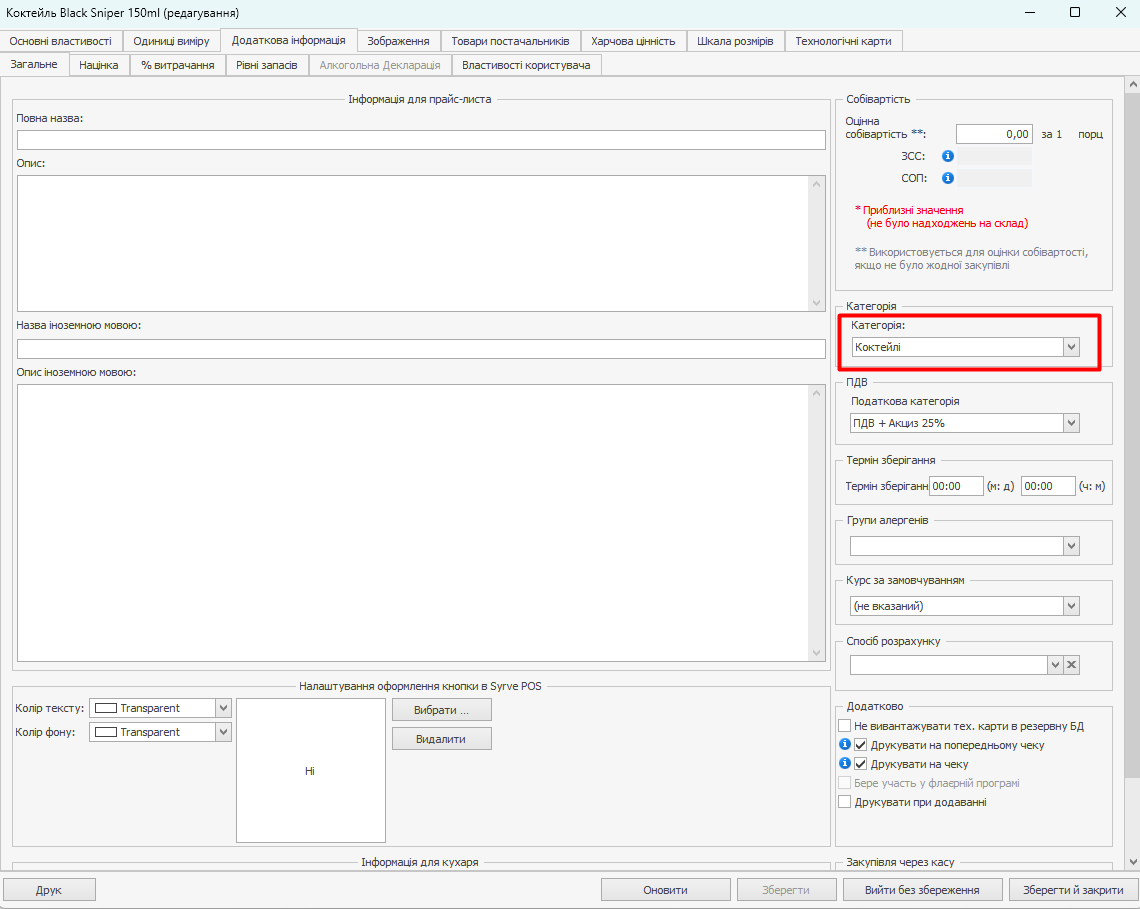 Попередньо для коктейлів, які повинні підпадати під умови програми, в номенклатурній картці на вкладці Додаткова інформація призначте категорію.