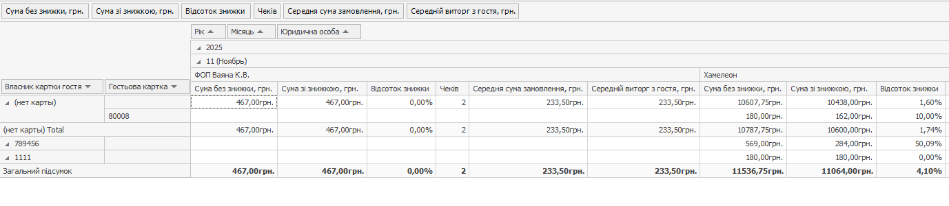Щоб створити звіт про знижки за гостьовими картками, відкрийте OLAP-звіт про продажі та додайте до нього: