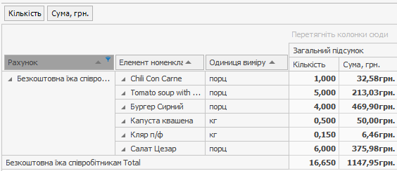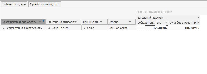Щоб скласти звіт про страви, списані на безкоштовне харчування співробітників, відкрийте OLAP Звіт за проводками та додайте до нього: