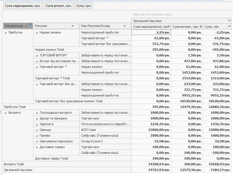 Щоб скласти звіт про фінансово-господарську діяльність підприємства, відкрийте OLAP Звіт за проводками і додайте до нього: