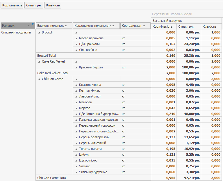 Щоб створити звіт про списання інгредієнтів проданих страв, відкрийте OLAP Звіт за проводками та додайте до нього: