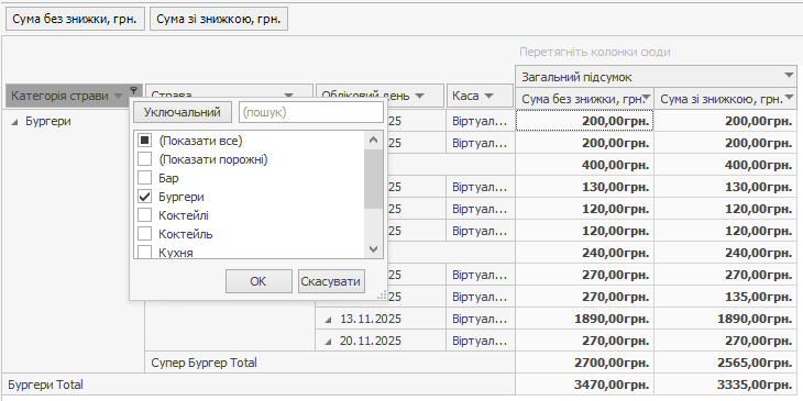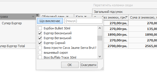 У звіт «Виручка за бургери (тільки Беконський, Веганський, Сирний)» з типом фільтрації «Включає» потраплять тільки страви, які відзначені у фільтрі — «Бургер Беконський», «Бургер Веганський» і «Бургер Сирний»