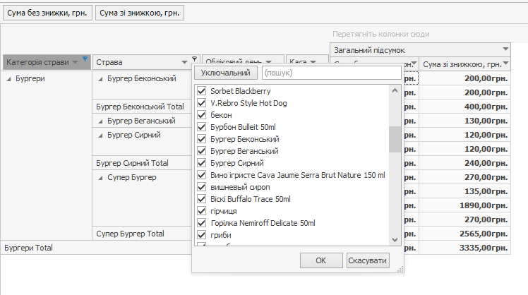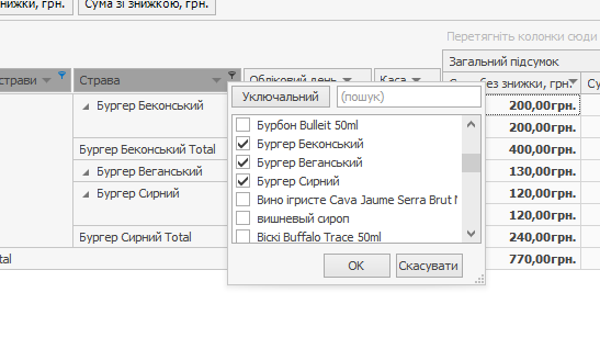 У звіті з включеним фільтром залишилися тільки страви з галочками