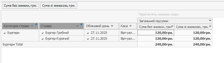 Налаштування звіту з фільтром «Уключальний»Після збереження звітів продайте страви «нові» страви «Бургер Курячий» і «Бургер Грибний», які в звітний період ще не продавалися.