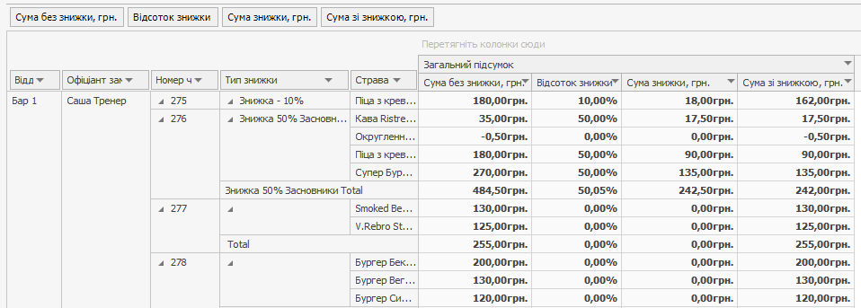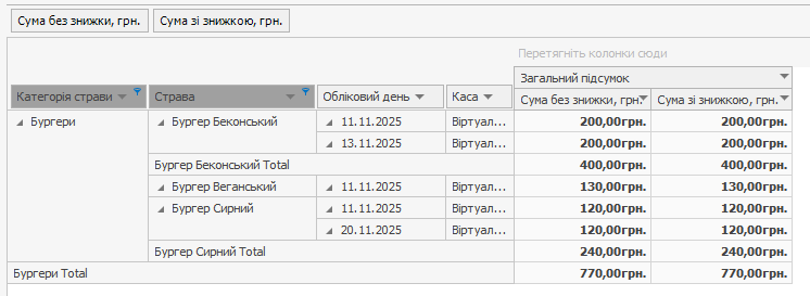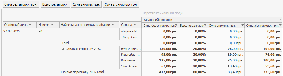 У цьому полі знижки та надбавки відображаються в окремих рядках. У звіті відразу видно, до якої страви застосовується яка знижка.