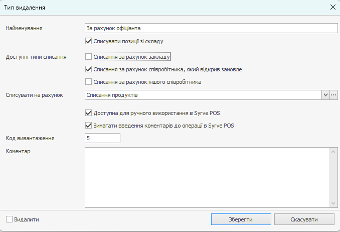 - Якщо ви вказали необхідність списання страви зі складу, то позначте типи списання, які будуть доступні вам для вибору в Syrve POS при видаленні страви з замовлення. Це може бути необхідно для зменшення ймовірності помилок з боку співробітників при виборі типу списання.
