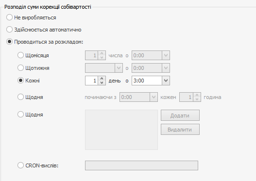 | CRON-вислів | Період розподілу задається CRON-виразом. Це необхідно у випадках, коли потрібно задати складний графік. Наприклад, в 1-й понеділок місяця корекція повинна виконуватися в обід, а в 2-й – о 3 годині ночі, і т. п. |