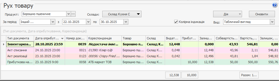 Залежно від типу документа рядки у звіті виділені кольором. Наприклад, видаткова накладна виділена блакитним, акт списання – рожевим, прибуткова накладна – зеленим тощо. Червоним кольором виділені документи, за якими сформувалися від'ємні залишки товару на складі. Жирним виділяються документи інвентаризації, в яких є розбіжність фактичної кількості з книжковими залишками. Щоб відключити виділення кольором рядків звіту, зніміть галочку Кольорова індикація.