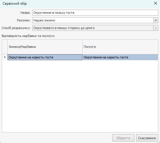 Округлення на користь гостя — правила обліку копійок, які відкидаються при округленні вартості замовлення до цілого числа. Цей збір створюється автоматично, і його не можна видалити. Він використовується, коли встановлено галочку Округлювати вартість замовлення до цілого на користь гостя в Налаштуваннях валюти.