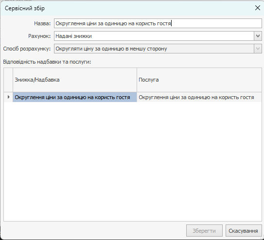 Сервісний збір «Округлення ціни за одиницю на користь гостя» має налаштування: