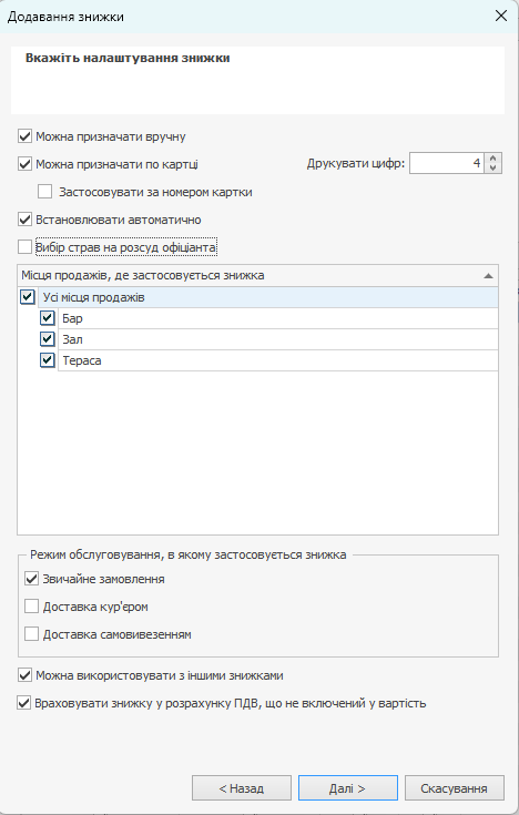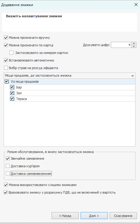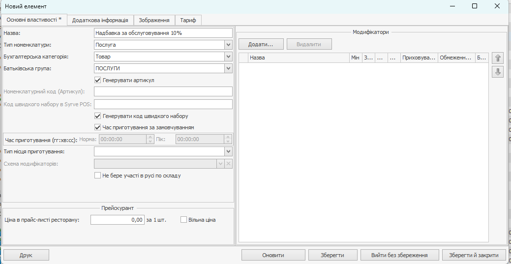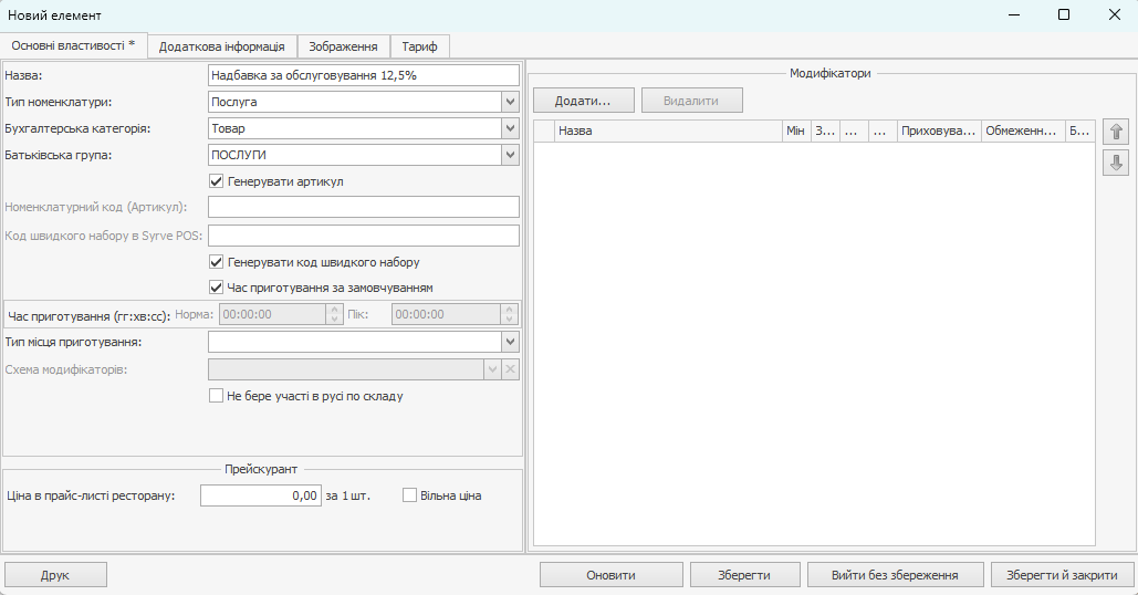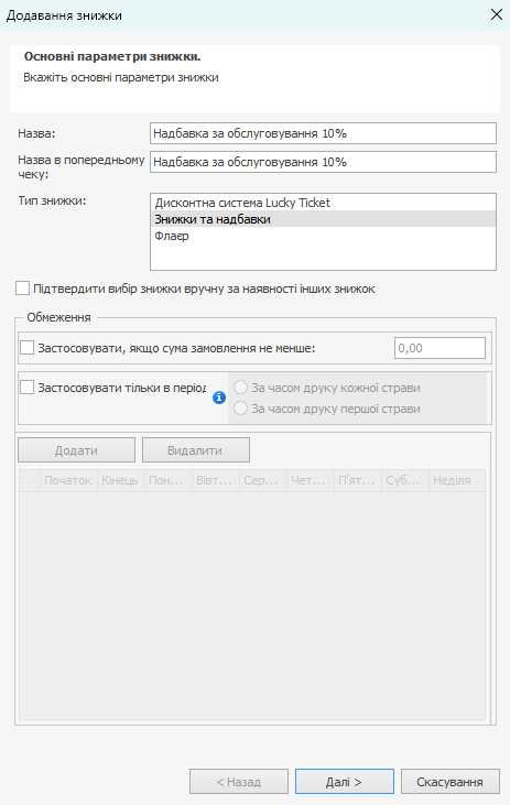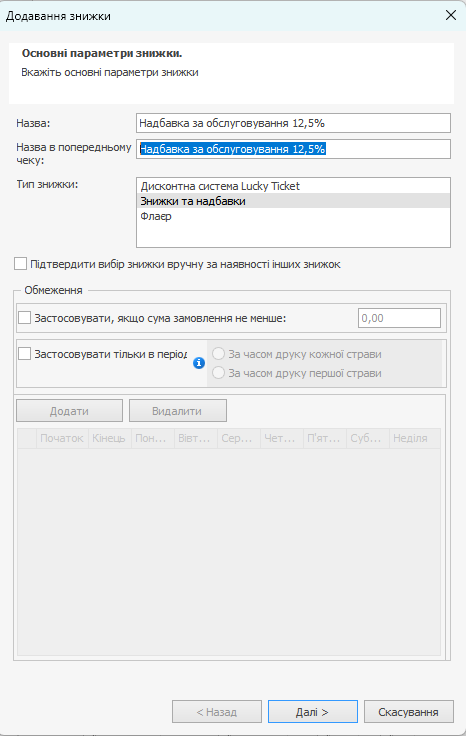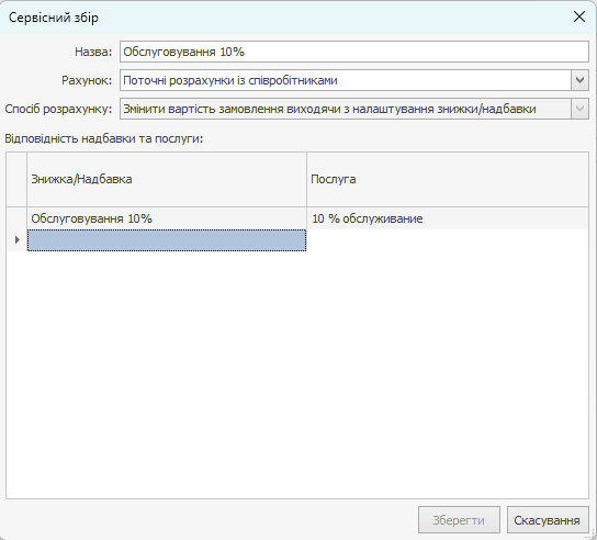 Надбавка за обслуговування використовується, коли ПДВ включений у вартість страв і для його розрахунку не потрібно враховувати суму надбавки за обслуговування. Як правильно налаштувати цей збір, див. нижче в цій статті.
