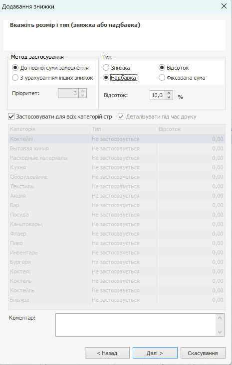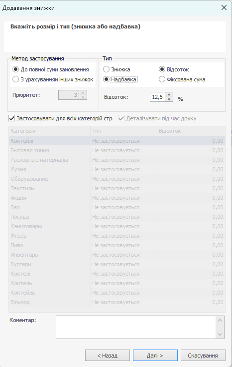 d. У другому рядку — надбавку «10%» і послугу «10%». У Syrve POS надбавки будуть взаємопов'язані: поки в замовлення додана надбавка 12,5%, надбавка 10% недоступна, і навпаки.