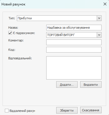 b. У полі Тип виберіть «Доходи», введіть Назву «Надбавка за обслуговування».