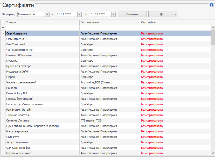 У звіті за сертифікатами представлена інформація про наявність сертифікатів та їх терміни дії для всіх товарів, оприбуткуваних на склади підприємства за звітний період. Щоб його побудувати, виберіть пункт меню Товари та склади або Звіти → Сертифікати