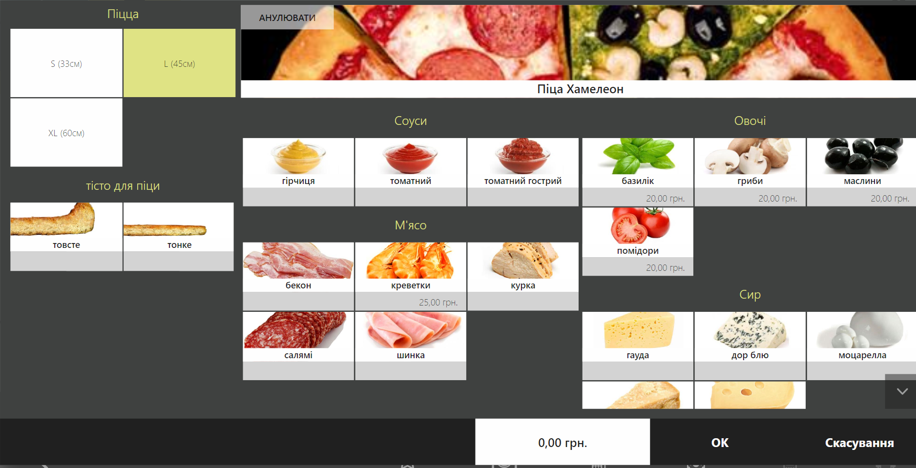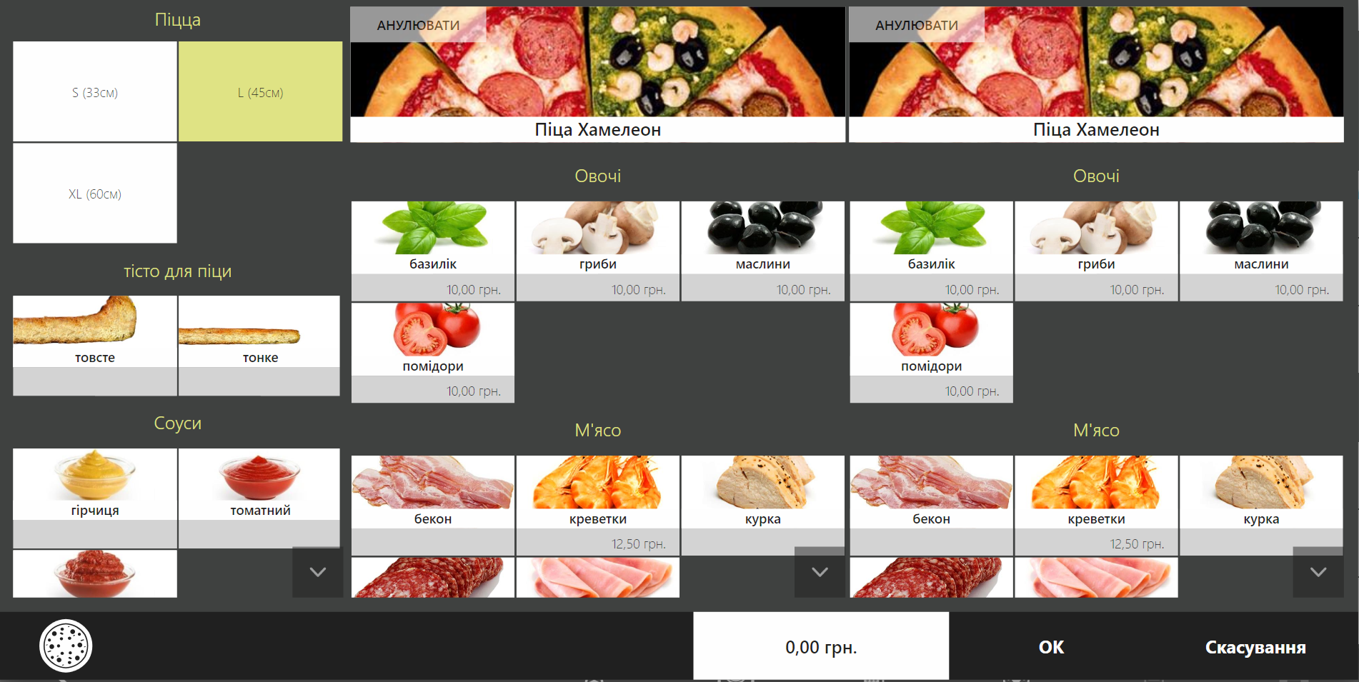 Якщо страва не продається половинками, основні модифікатори відображаються ліворуч, додаткові — праворуч.