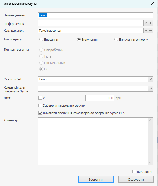 - Якщо ви плануєте реєструвати цю операцію внесення або вилучення грошових коштів у Syrve POS, зніміть галочку Забороняти вводити вручну.